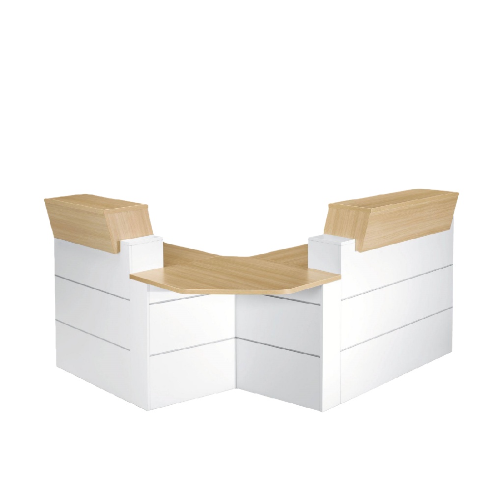 Comptoir d’accueil d’angle en L, finition blanc et bois naturel