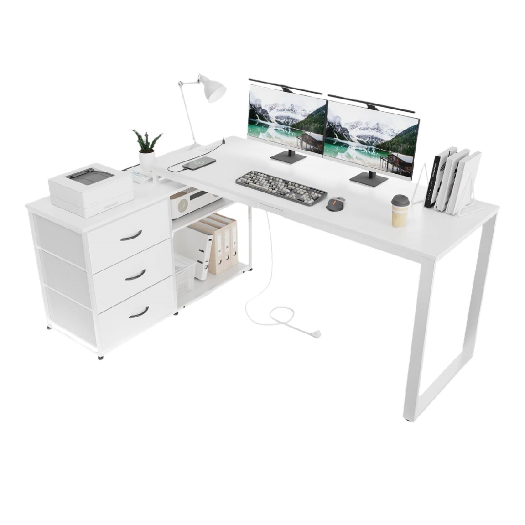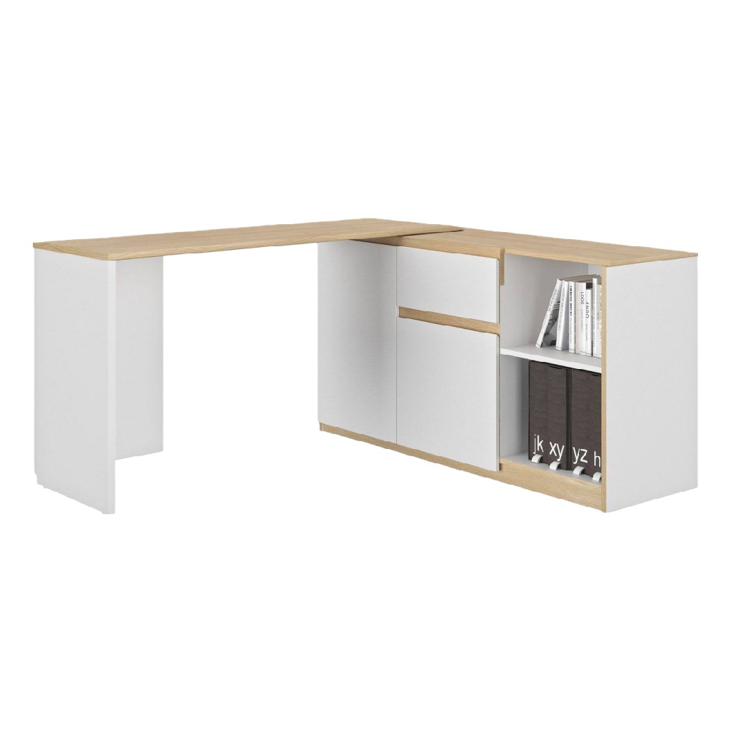 • Bureau d’angle en L avec rangements et tiroirs, finition bois et blanc